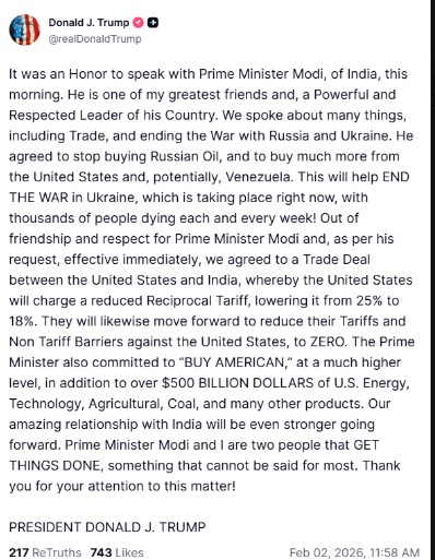 “It was an honour to speak with Prime Minister Modi, of India, this morning. He is one of my greatest friends, a Powerful and Respected Leader of his Country…He agreed to stop buying Russian oil, and to buy much more from the United States and, potentially, Venezuela…Out of friendship and respect for Prime Minister Modi and, as per his request, effective immediately, we agreed to a Trade Deal between the United States and India, whereby the United States will charge a reduced Reciprocal Tariff, lowering it from 25% to 18%,” the post said.